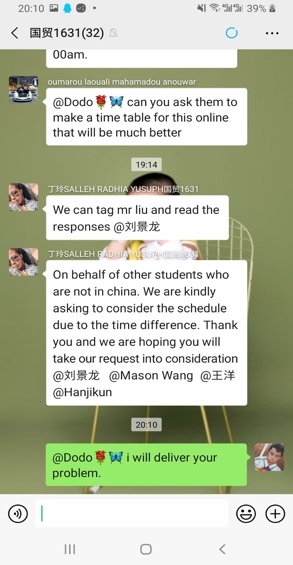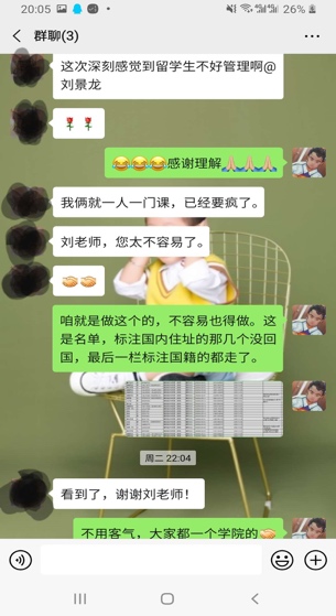 作为学校留学生人数最多的学院,如何协调管理学院87名国际学生如期开展网上学习,成为摆在全院师生面前的一项紧迫任务。学习平台皆为中文,国际学生看不懂怎么办?学院87名国际学生,有52人在国外怎么办?境内手机号码在国外无法注册绑定教学平台怎么办?一切难题,只有在实干中才能破解。针对语言困难,学院辅导员刘景龙和任课教师一起,制作英文指南,指导学生平台使用;为解决跨国教学难题,他主动与教务、教师、学生沟通对接,及时了解师生需求,密切掌握学生入驻情况,一对一指导学生注册;《计算机应用基础》这门课全班29个学生只有8人在国内,境外学生无法注册平台,面临无法如期网上开课的问题,刘老师主动找任课教师一起想办法,使得问题得以解决。在师生的共同努力下,学院国际学生基本能如期开展网上学习。居家办公对及时有效地开展工作造成了一定困难,刘老师有时难免着急,但看到家人每天冒着被传染的危险,早出晚归到车站抗疫一线值班,他又不断提醒自己一定要稳住,把工作做扎实。他说:“作为党员,我们必须与大局同频,与时代同步,把工作当事业干,把事业当使命干。我坚信,我们一定能打赢这场抗疫防控阻击战”。