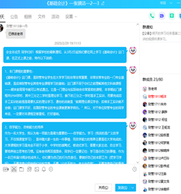 2、充分利用QQ课程群的强大功能辅助教学,提高网络教学效果。财管专业主要利用“QQ课程群+中华会计网校高校一体化教学平台”开展线上教学。QQ课程群有很多优势,如一般不卡顿、直播课堂可分享教师屏幕、学生一般不用刻意登录就在线等。周萍老师争做直播达人。采用QQ群签到,发布共享文件、QQ直播课堂和高校一体化平台三个工具,开展线上教学。尤其是QQ课堂环节,采用直播,连麦,分享屏幕的方式,做到对上一节课先复习,对本节课开展预习;做上一节课布置的重点难题进行在线讲解,对本节课的随堂作业布置完成时间,整个流程下来,时间紧凑,学生在线反馈积极。学生一方面能学到平台上优秀的视频资料,也能根据本校的课程安排,对每一章节的重点和难点予以在线消化,真正做到网课质量不打折。