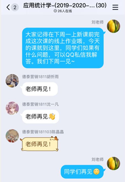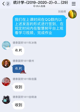 靳磊老师充分利用平台的测验和任务功能督促学生自主学习和思考。刘芳老师采取上课时间在QQ群内以发言的形式进行签到,在规定时间内在教学平台上观看学习视频,完成作业,如果遇到问题随时联系老师解决。