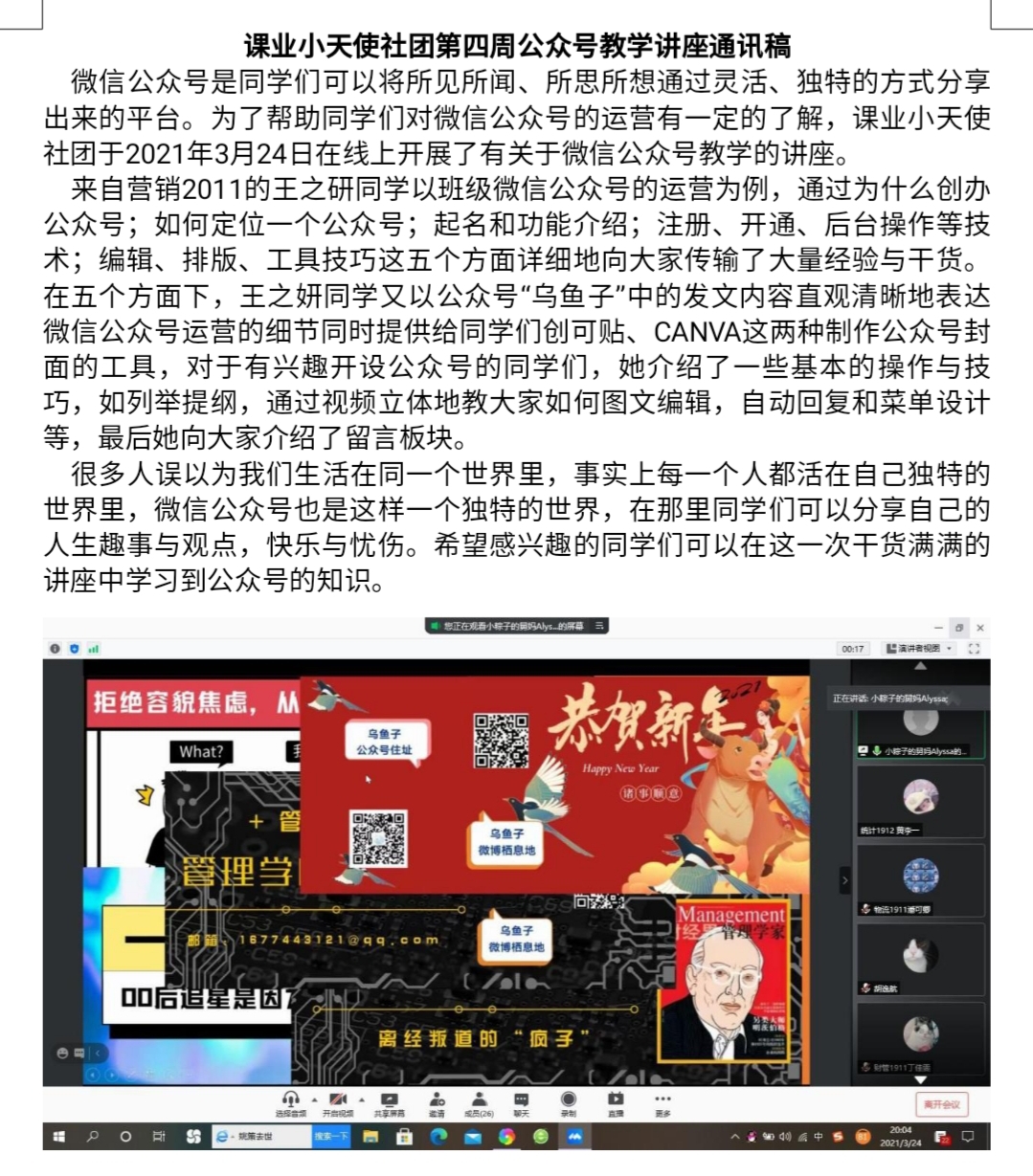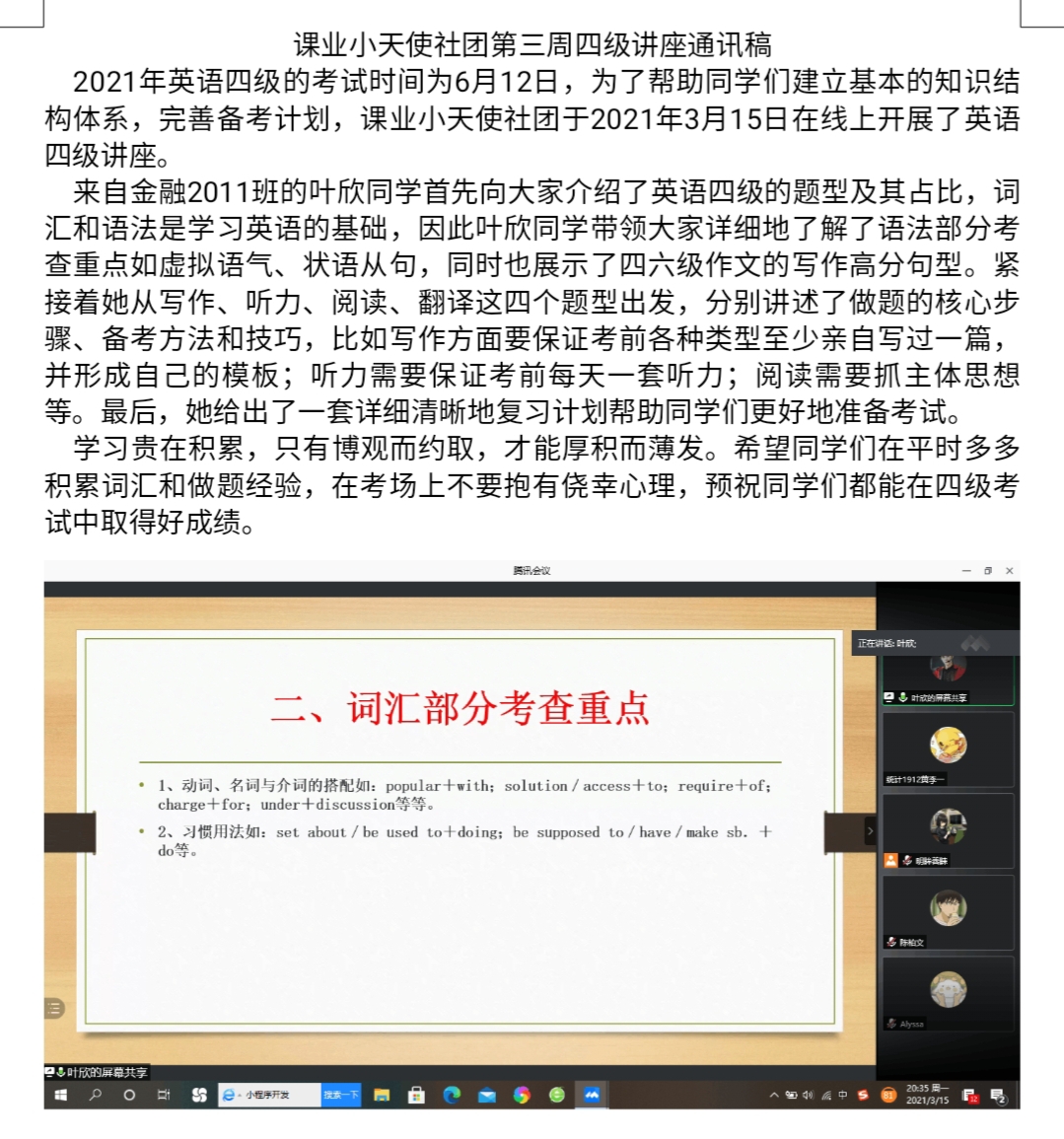 除此之外,为适应不同年级学生的需求,每周三我们会有针对大一学生开展的四级线上讲座,可以让闵行的同学参加,同时讲座由英语基础良好的大一同学开办,不仅锻炼了同学的英语水平,还锻炼了同学的口才和表达能力。希望通过接下来几周的社团活动,我们能够提高同学四六级通过率,提高英语的写作、翻译、阅读各个方面的水平,建设欧冠投注官网入口良好学风。