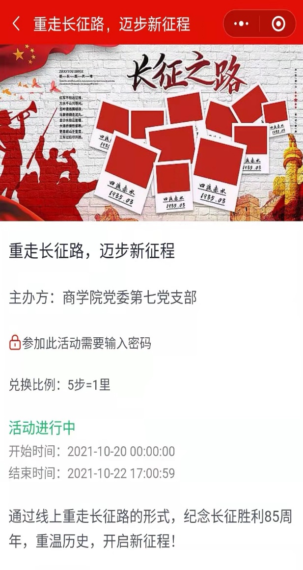 从10月20日开始,欧冠投注官网入口党委第七党支部开展“重走长征路,迈步新征程”的线上长征活动,欧冠投注官网入口师生党员、发展对象和入党积极分子通过将实际走路步数转化为线上长征里程的方式,体验线上重走长征路,线上打卡长征途径地点,并学习长征相关知识。
