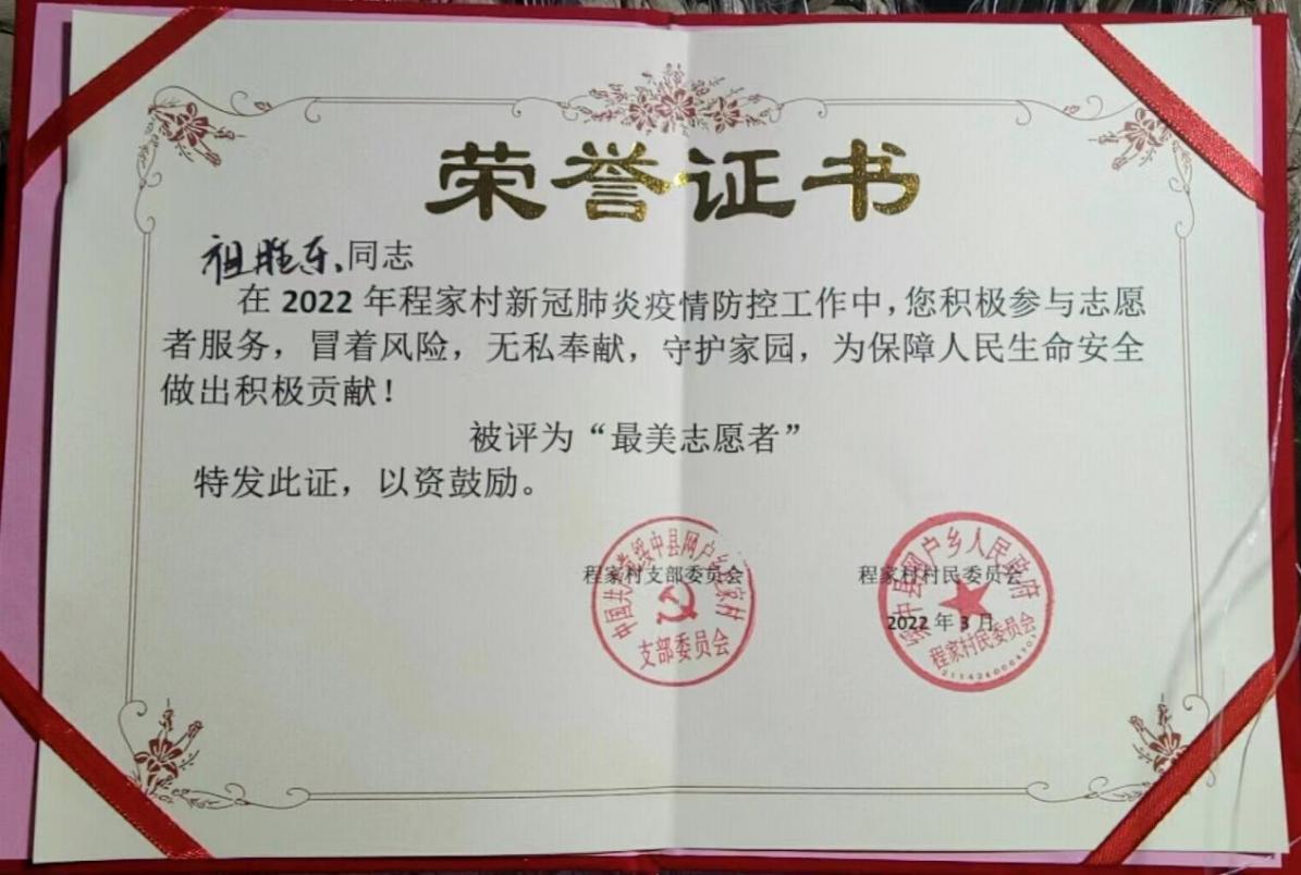 令人惊喜的是,前几日乡政府以及村委会为我们志愿者颁发了荣誉证书。对我来说,这张证书不仅仅是家乡对我工作的肯定,更是家乡党组织对我这名入党积极分子的鼓励,也更坚定了我加入中国共产党的决心。在这段难忘的日子里,一直是村里的党员冲锋在前,带领我们起早贪黑开展各项工作,他们顾不上自己的小家,一心帮助村民及时解决封控期间吃穿住用行大事小情,构筑了群防群治的严密防线。看着他们,我真正明白了为什么只有中国共产党才能领导中国。