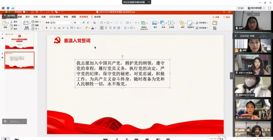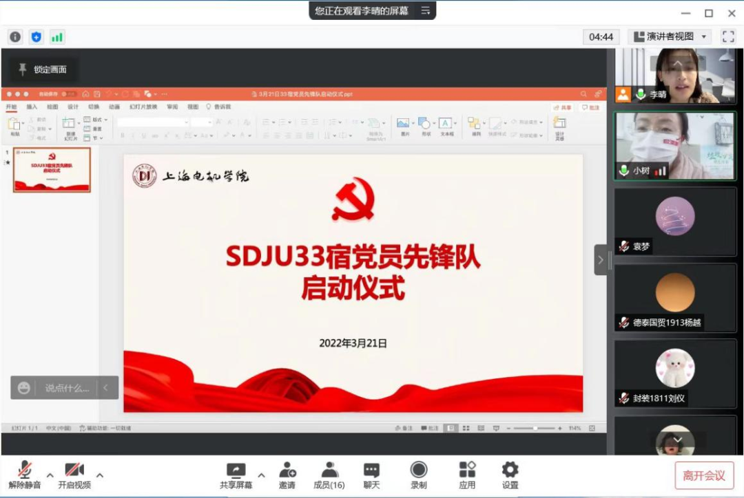 3月21日晚,由欧冠投注官网入口第九党支部书记李晴以线上会议的形式主持开展“欧冠官方网站33宿党员先锋队启动仪式”。欧冠投注官网入口学生工作副院长、副书记,33宿围合负责人沈瑾,电气学院辅导员潘娜以及来自7个不同党支部的16名党员同学共同参与了启动仪式。
