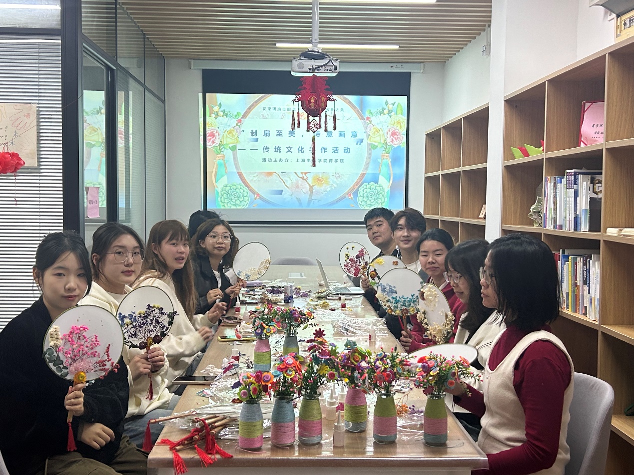 活动现场,学生干部为大家准备了剪刀、胶水、扇子等材料,并现场讲解了团扇的发展历史和团扇的形状、永生花的保存方式及特点……在一番学习和了解过后,同学们正式开始制作。大家充分发挥想象力,不拘一格,融入自己的想法,细细构图,几片叶子,数朵干花,细心粘贴,一把把平平无奇的扇子瞬间变得“高雅”起来,整个活动现场充满了欢乐的气息。